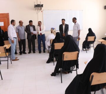 الأمين العام للمجلس المحلي ونواب رئيس جامعة المهرة يدشنون الامتحانات النهائية للفصل الثاني بكليات الجامعة.