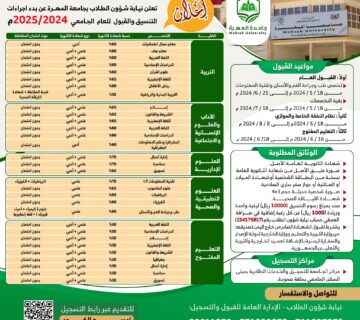المهرة/إعلام الجامعة: 15/مايو/2024م. أعلنت نيابة شؤون الطلاب بجامعة المهرة، عن موعد بدء إجراءات التنسيق والقبول للعام الجامعي الجديد 2024/ 2025م، ... قراءة المزيد