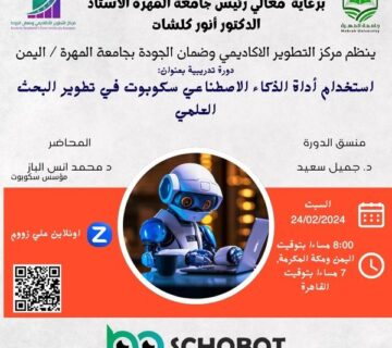 المهرة/إعلام الجامعة: 26/فبراير/2024م. نظم مركز التطوير الاكاديمي وضمان الجودة بجامعة المهرة، دورة تدريبية في استخدام أداة الذكاء الاصطناعي (سكوبوت) في ... قراءة المزيد