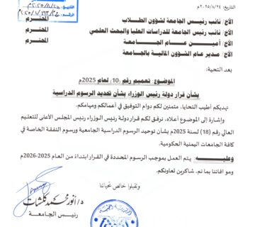 المهرة/إعلام الجامعة: 27/أغسطس/2025م. رحّب رئيس جامعة المهرة، معالي الدكتور أنور محمد كلشات، بقرار دولة رئيس مجلس الوزراء، رئيس المجلس الأعلى ... قراءة المزيد