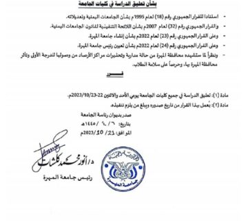 المهرة/إعلام الجامعة: 21/أكتوبر/2023م. اصدر رئيس جامعة المهرة معالي الدكتور أنور محمد كلشات توجيهاته بتعليق العملية التعليمية في جميع كليات الجامعة ... قراءة المزيد