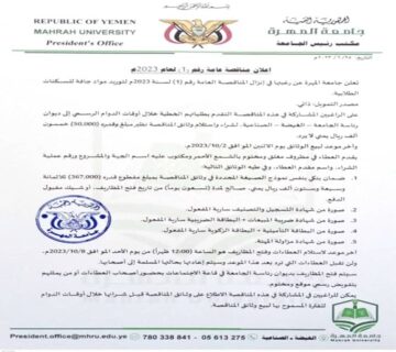 المهرة/إعلام الجامعة: 25/سبتمبر/2023م. تعلن جامعة المهرة عن رغبتها في إنزال المناقصة العامة رقم (1) لسنة 2023م لتوريد مواد جافة للسكنات ... قراءة المزيد