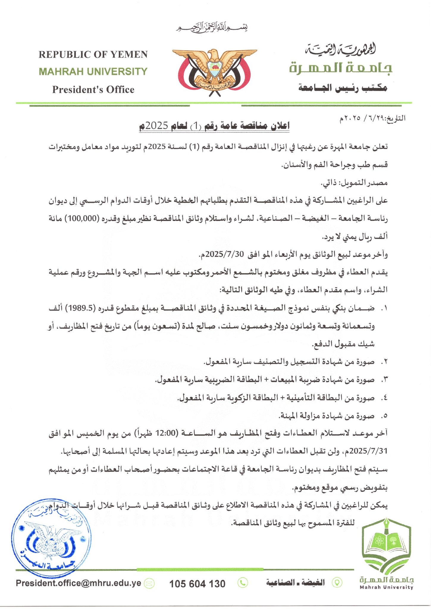 تعلن جامعة المهرة عن رغبتها في إنزال المناقصة العامة رقم (1) لسنة 2025م لتوريد مواد معامل ومختبرات قسم طب وجراحة الفم والأسنان.