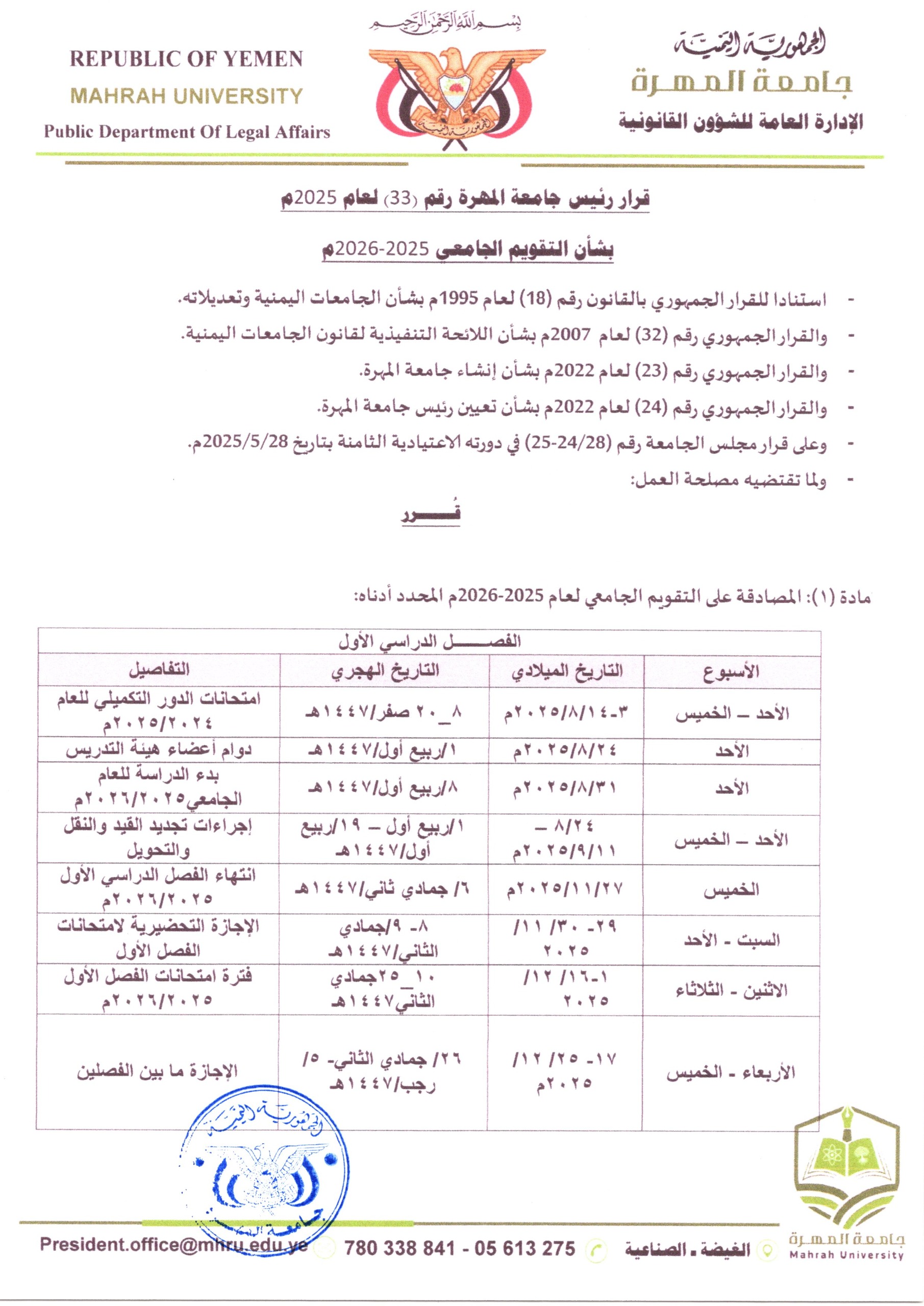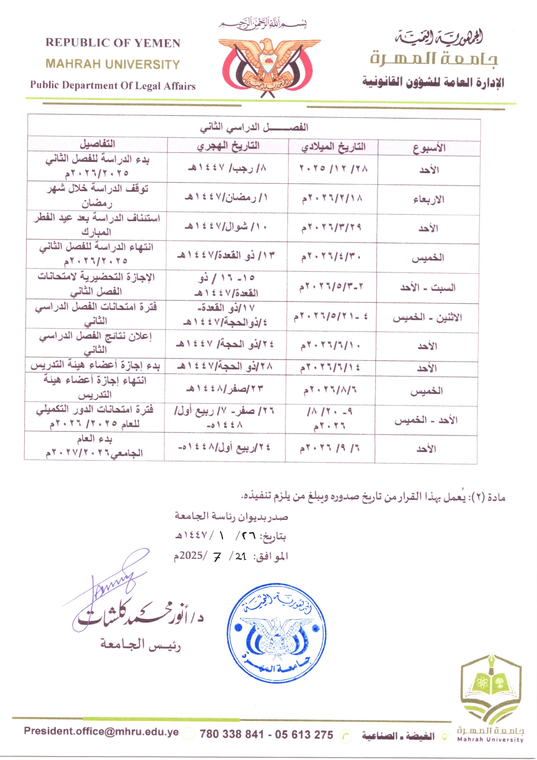 أعلنت جامعة المهرة، اليوم الاثنين، عن التقويم الجامعي لعام 2025/ 2026م، استناداً إلى قرار رئيس الجامعة معالي الدكتور أنور محمد كلشات، رقم (33) لسنة 2025م الصادر في 2025/7/21م وبناء على قرار مجلس الجامعة رقم (28/ 24- 25) في دورته الاعتيادية الثامنة المنعقدة بتاريخ 28/ 5/ 2025م.