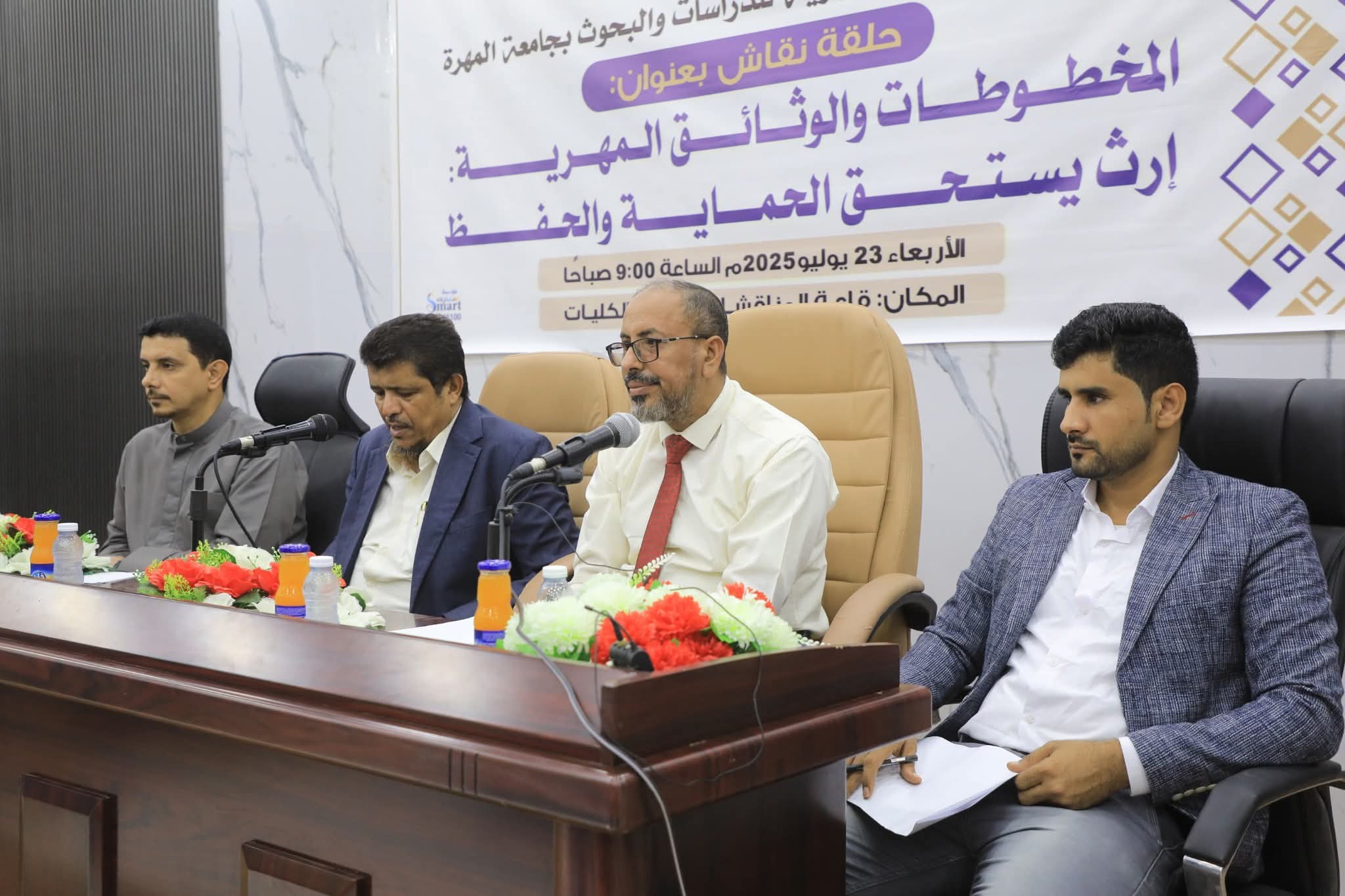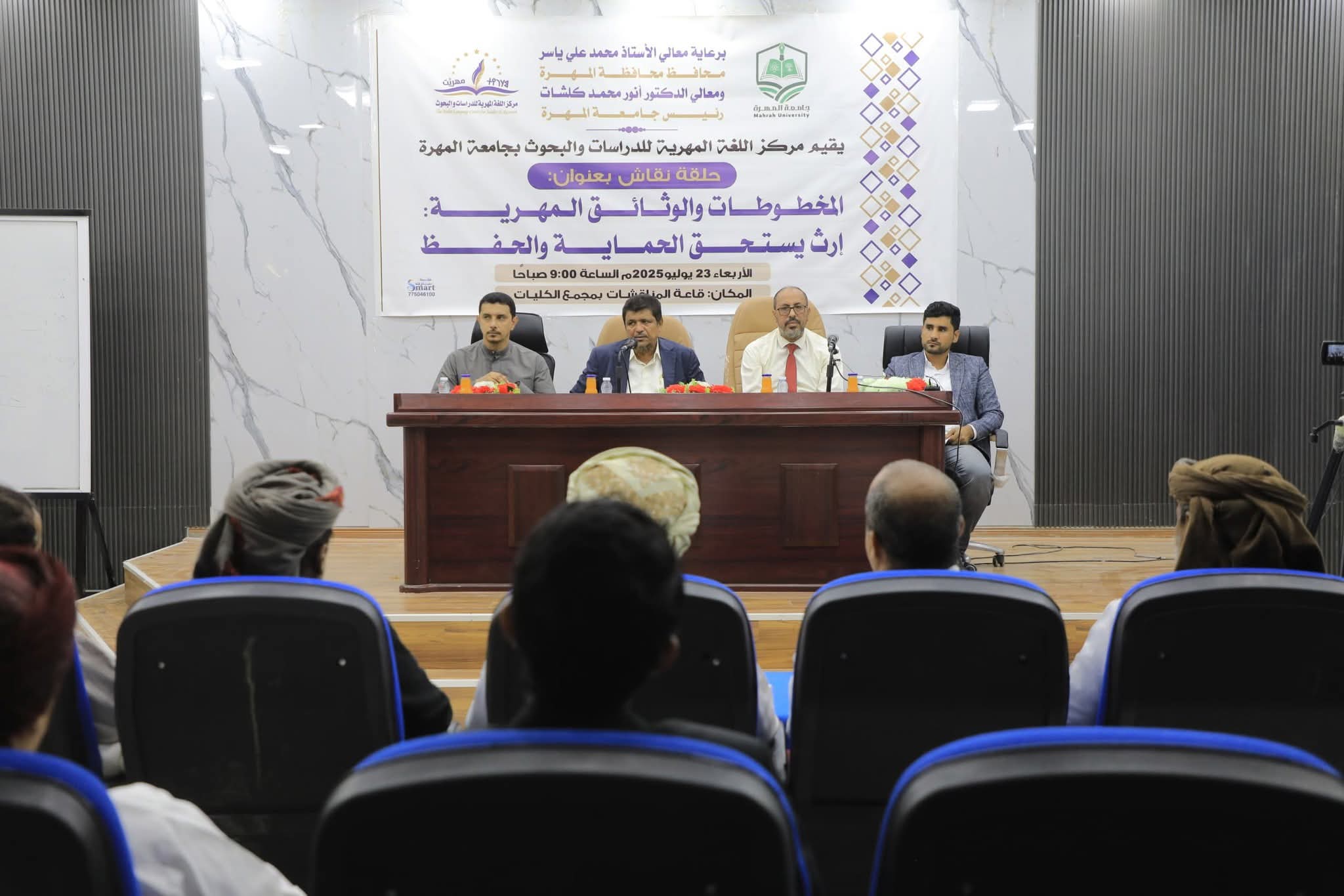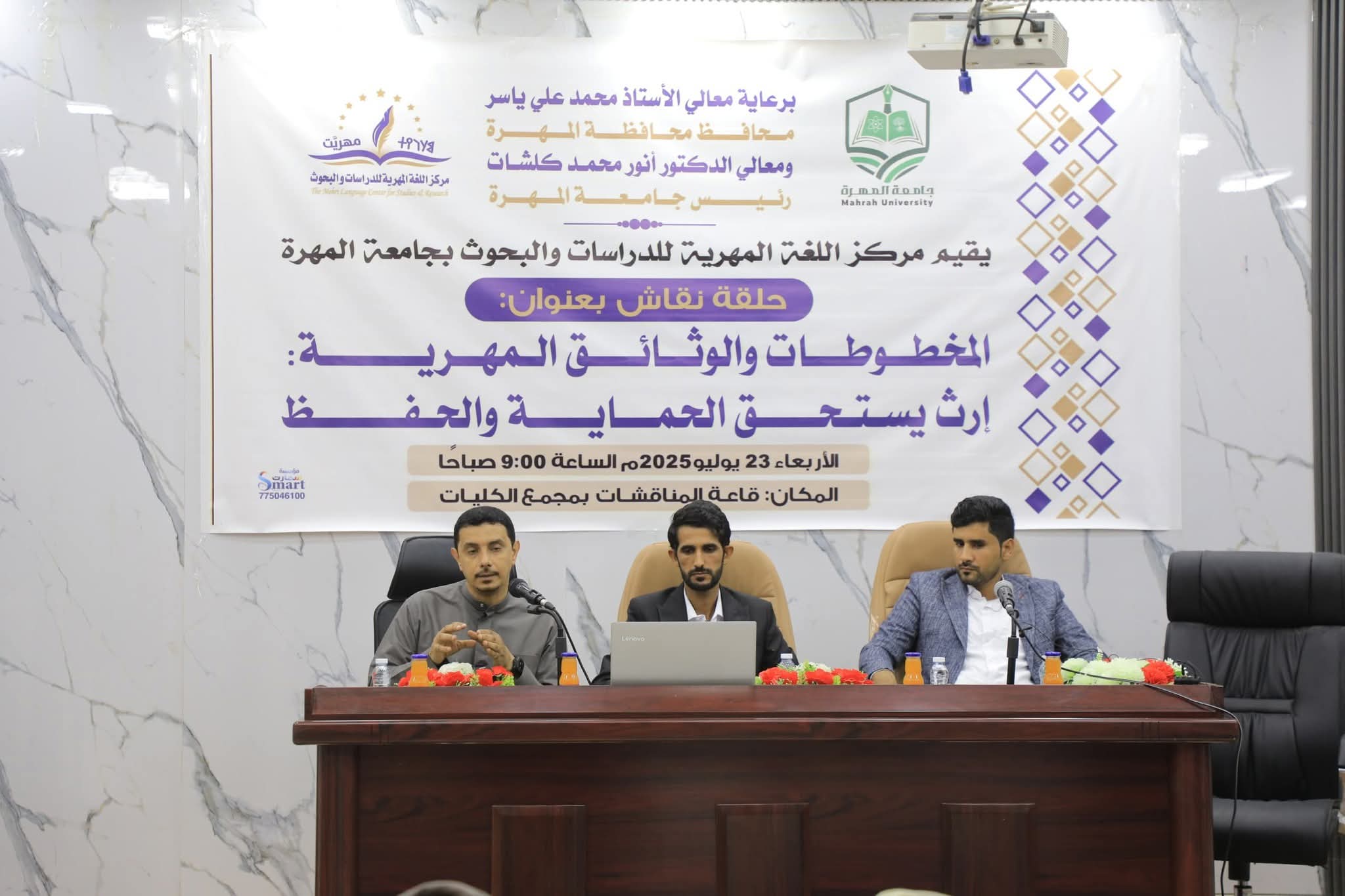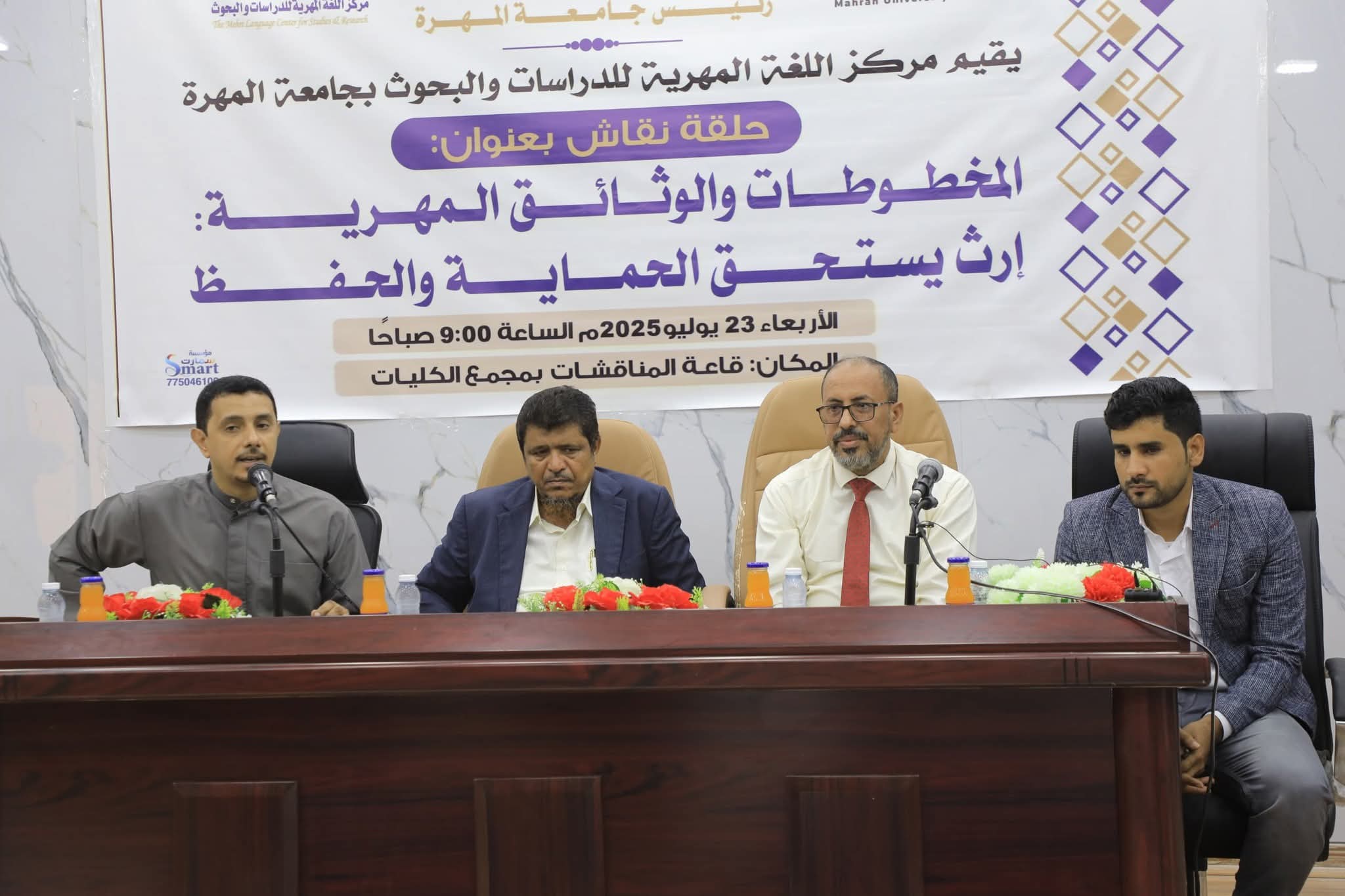 نظم مركز اللغة المهرية للدراسات والبحوث بجامعة المهرة، اليوم الأربعاء، في مدينة الغيضة، حلقة نقاش بعنوان: المخطوطات والوثائق المهرية إرث يستحق الحماية والحفظ، بحضور عدد من المختصين والمهتمين والشخصيات الاجتماعية.