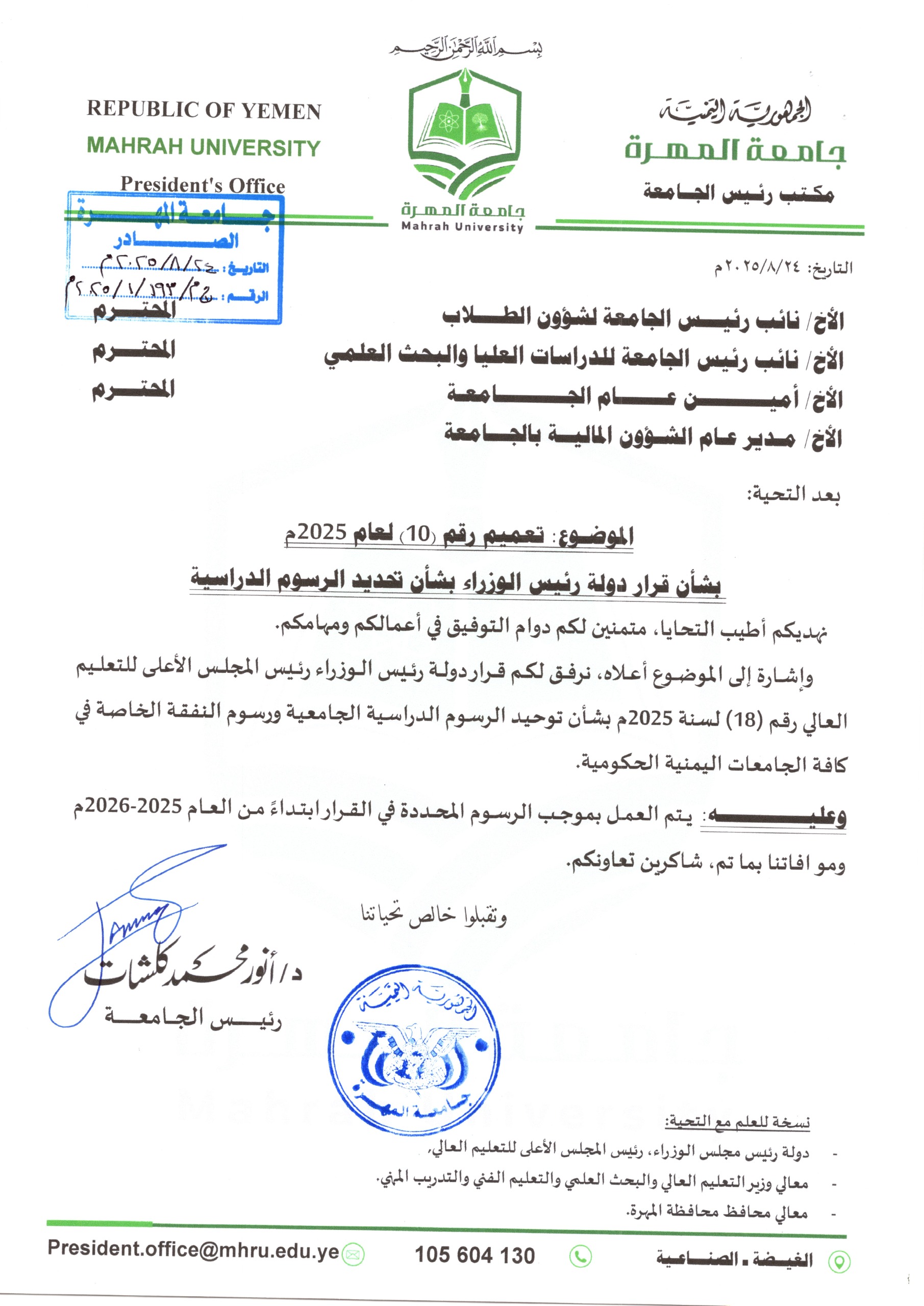 رحّب رئيس جامعة المهرة، معالي الدكتور أنور محمد كلشات، بقرار دولة رئيس مجلس الوزراء، رئيس المجلس الأعلى للتعليم العالي، رقم (18) لسنة 2025م، والخاص بتحديد وتوحيد الرسوم الدراسية ورسوم النفقة الخاصة في جميع الجامعات الحكومية اليمنية.