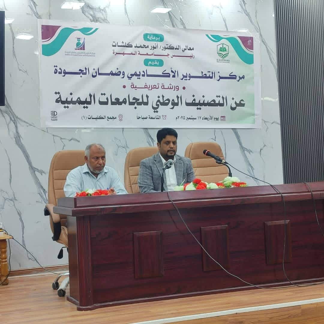 برعاية رئيس جامعة المهرة معالي الدكتور أنور محمد كلشات، أقام مركز التطوير الأكاديمي وضمان الجودة، الورشة التعريفية الخاصة بـ التصنيف الوطني للجامعات اليمنية، بحضور نواب رئيس الجامعة والأمين العام للجامعة ومساعده وعمداء الكليات ونوابهم ومديري المراكز ونوابهم وأعضاء هيئة التدريس.