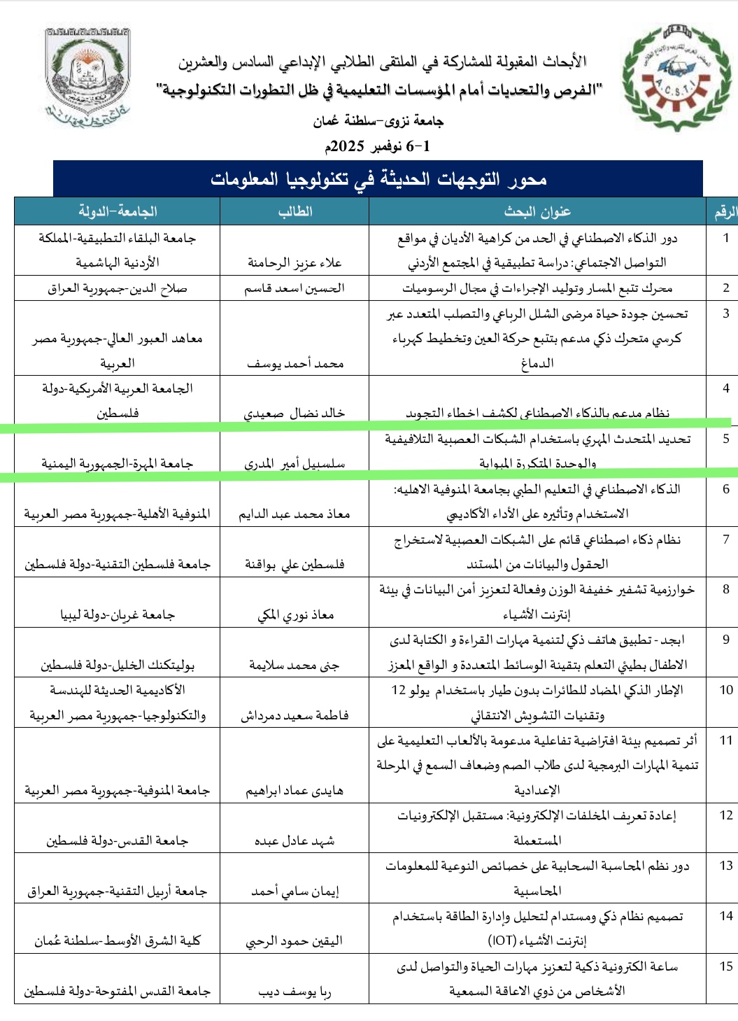 أعلن المجلس العربي للتدريب والإبداع الطلابي بالمملكة الأردنية الهاشمية عن أسماء الأبحاث العلمية الفائزة في الملتقى الطلابي الإبداعي السادس والعشرين، والذي تستضيفه جامعة نزوى بسلطنة عُمان خلال الفترة من 1 إلى 6 نوفمبر 2025م.