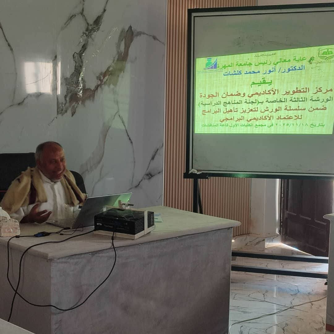 نفّذ مركز التطوير الأكاديمي وضمان الجودة بجامعة المهرة، ورشة تدريبية متخصصة ضمن خطته الهادفة إلى رفع جاهزية برامج البكالوريوس للتقدم للاعتماد الأكاديمي البرامجي، برعاية رئيس الجامعة معالي الدكتور أنور محمد كلشات.